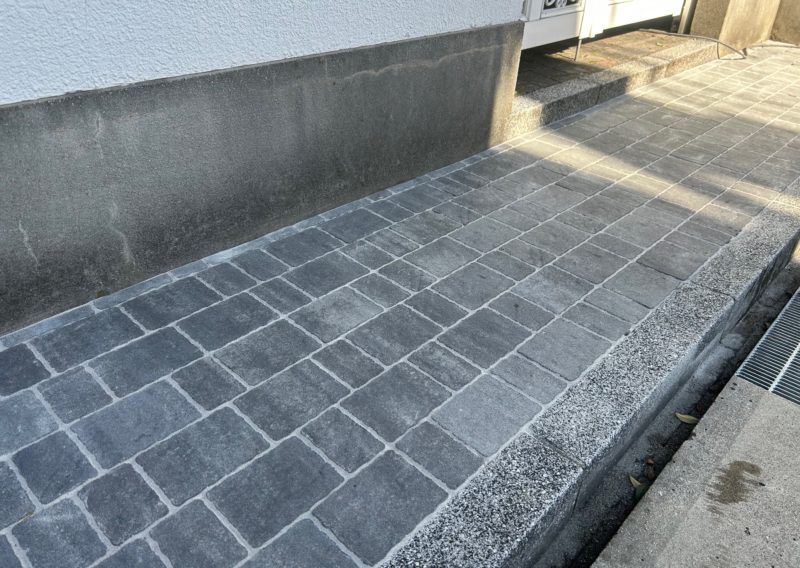 名古屋市名東区豊が丘にて玄関前の舗装材のレンガの部分に水が溜まりやすい為