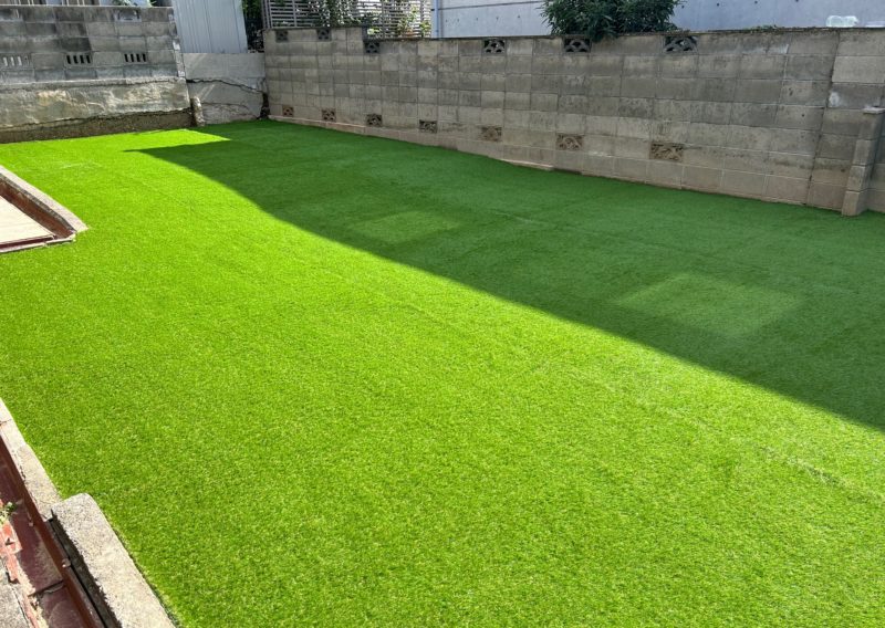 テープでしっかりと止めてからの人工芝敷かせていただきました。