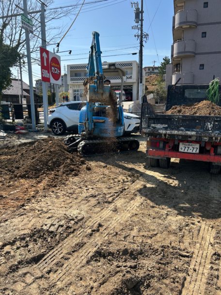 まず、重機で雑草や植木、土を平らにすべく残土の撤去と整地を行いました。